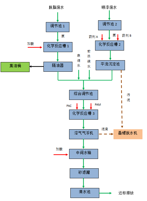 噴涂工藝在金屬表面處理中運用極其廣泛,在生產(chǎn)過程中基本上都有噴涂廢水產(chǎn)生,噴涂廢水中呈酸性且含有多種金屬離子和非金屬離子,其中有些為一類毒物,必須經(jīng)處理后達(dá)標(biāo)后排放。噴涂廢水污染物種類較多,水質(zhì)、水量波動較大,工程、工藝設(shè)計時需對源頭水進(jìn)行分流,并對高濃度廢液進(jìn)行分質(zhì)預(yù)處理,以提高后續(xù)處理工藝的穩(wěn)定性,進(jìn)而確保噴涂廢水處理穩(wěn)定達(dá)標(biāo)排放。